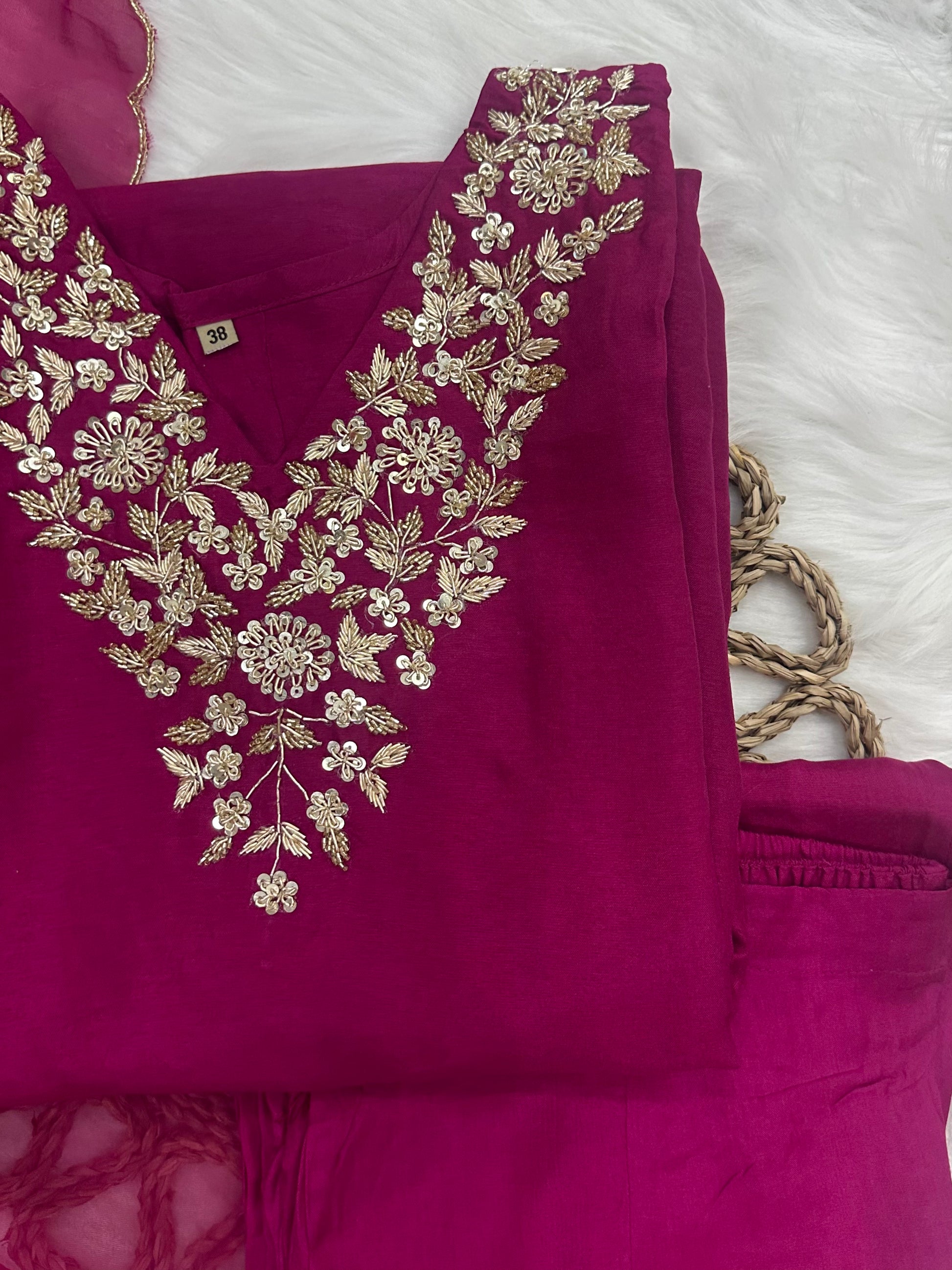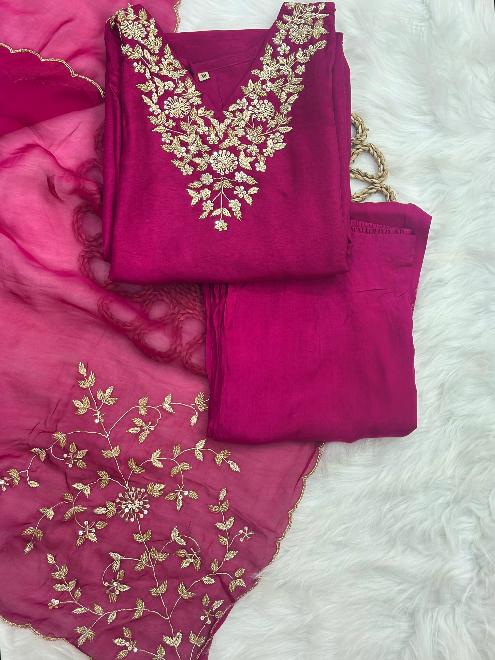 Step into timeless elegance with our Rajvika Suit, a regal creation in Russian Silk adorned with exquisite zardozi hand work. The ensemble is paired with silk pants and organza dupatta delicately detailed for a touch of ethereal charm. Designed for festive gatherings and grand celebrations, this outfit radiates sophistication with every thread.